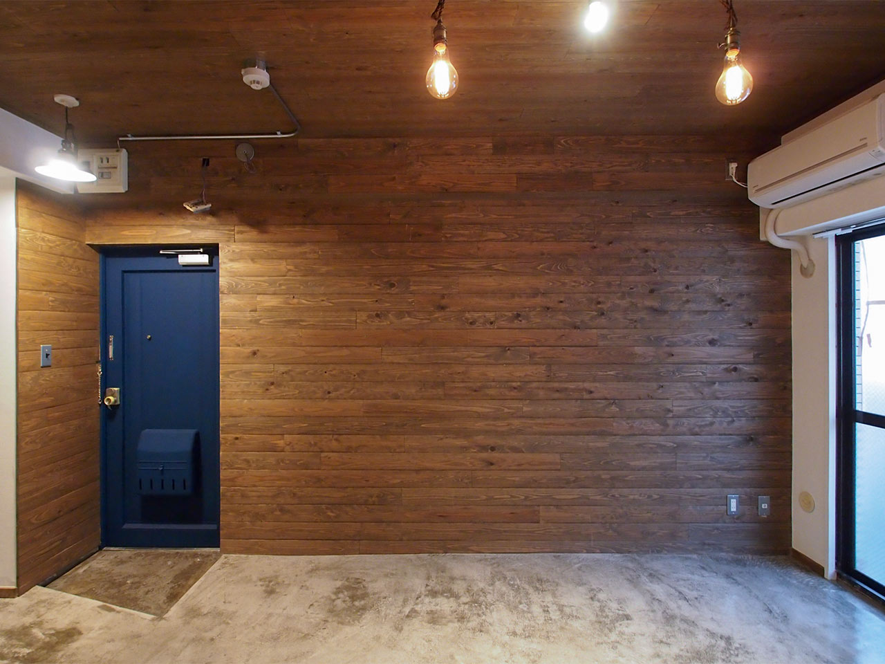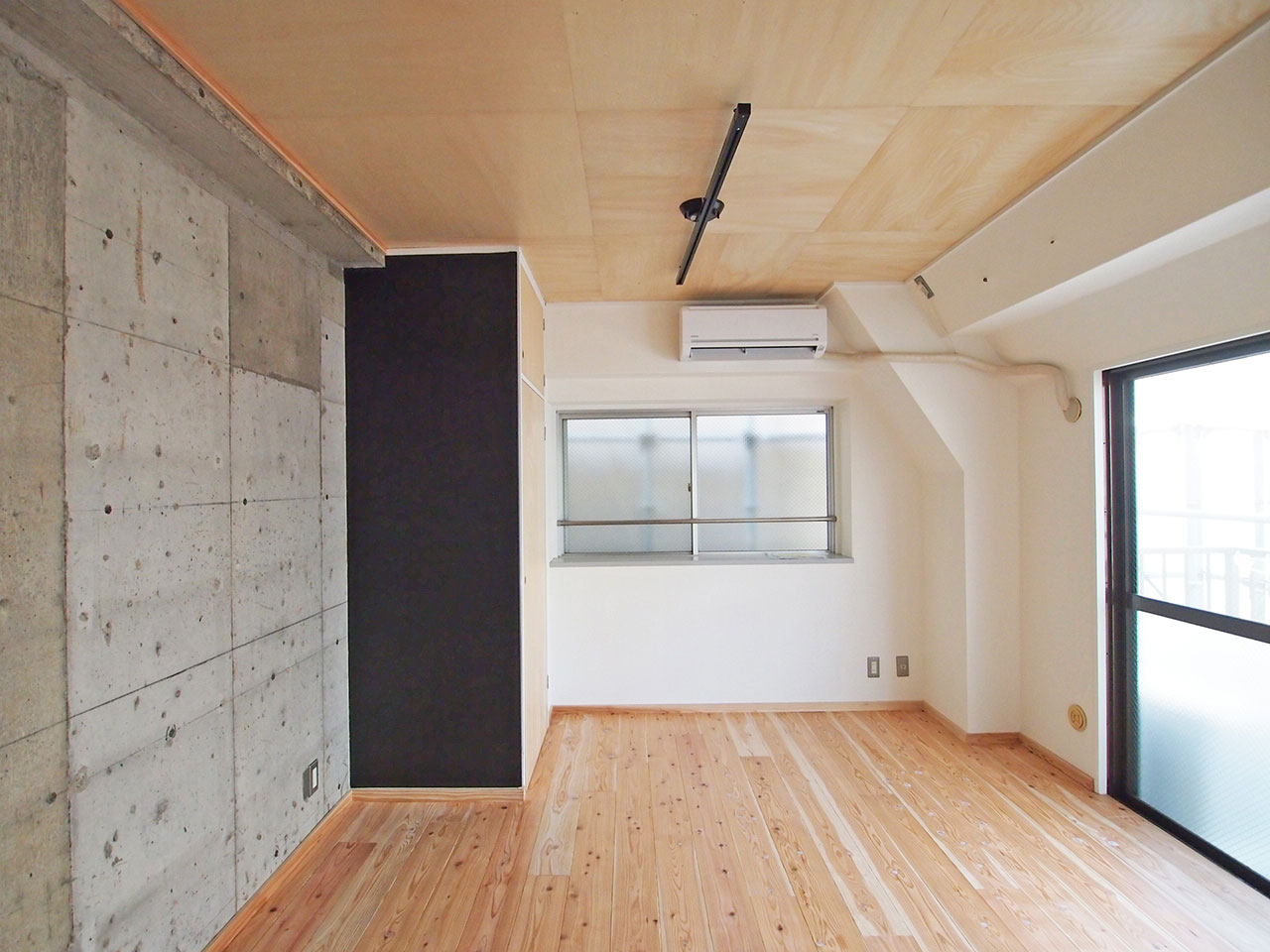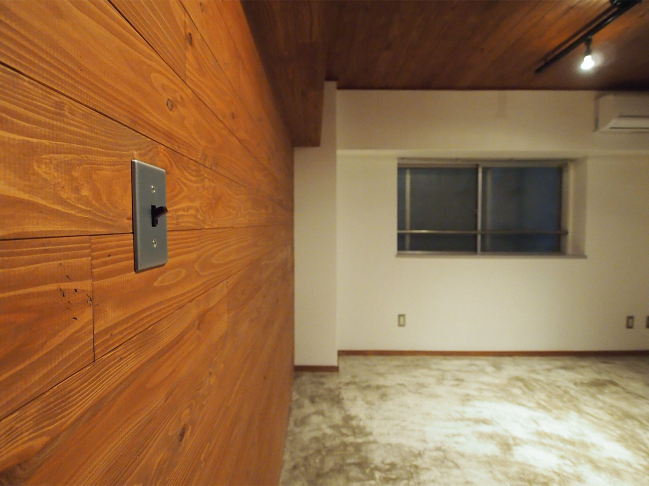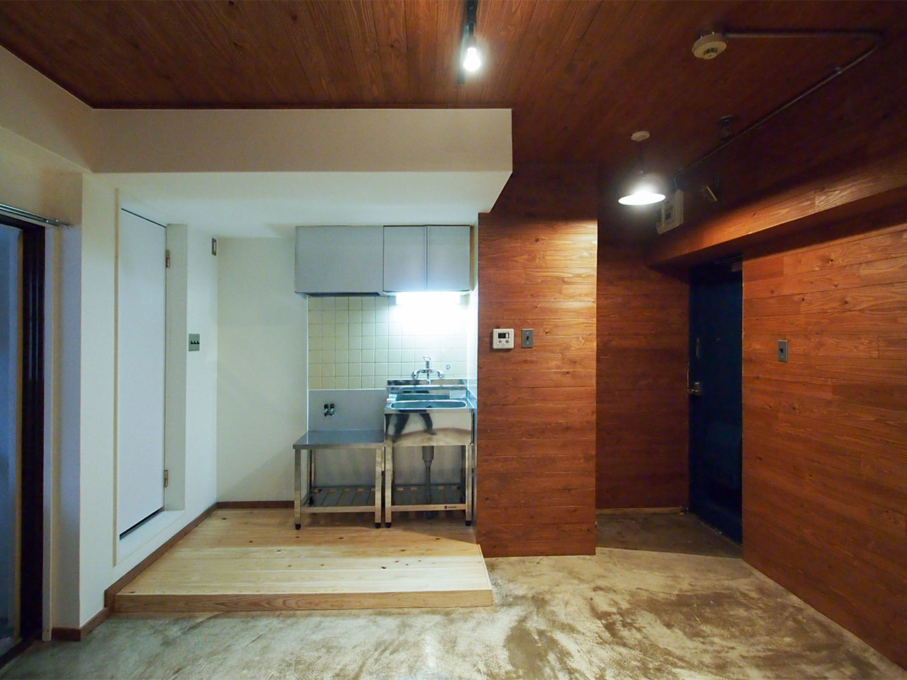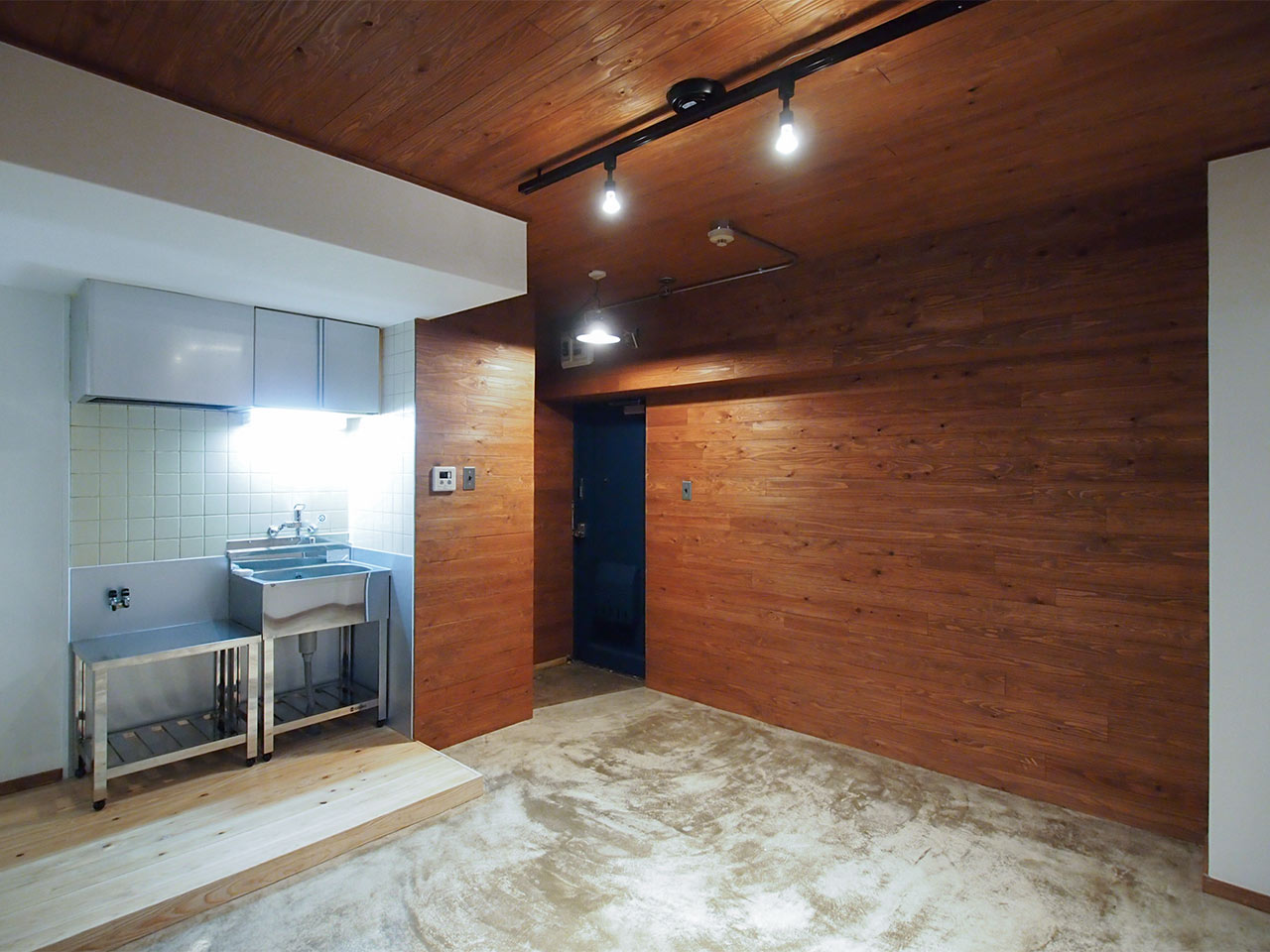 壁面の解体工事の過程で出てきたコンクリート素地の壁に下地材で仕上げた天井面と、敢えて作り込み過ぎない引きの発想の空間。暖色のあかりを静かに灯せば倉庫や作業場のような雰囲気が醸し出されるかもしれません。