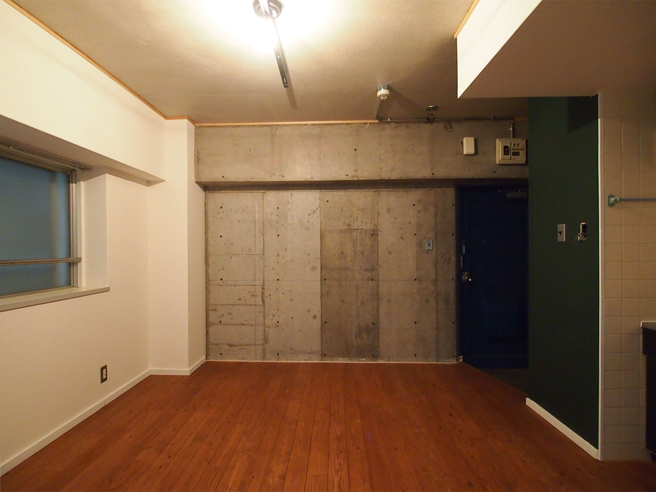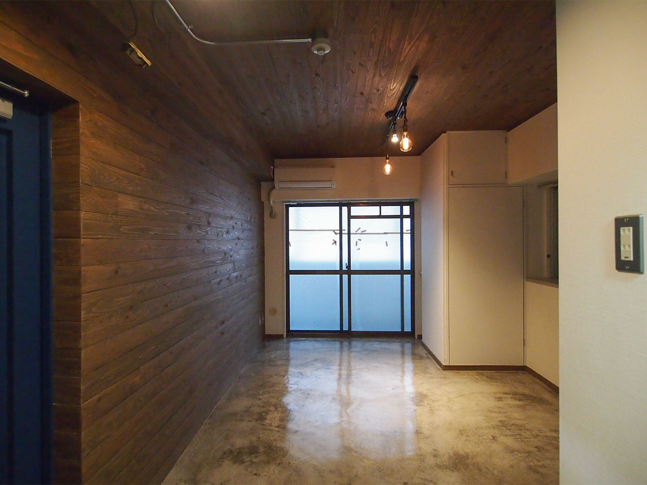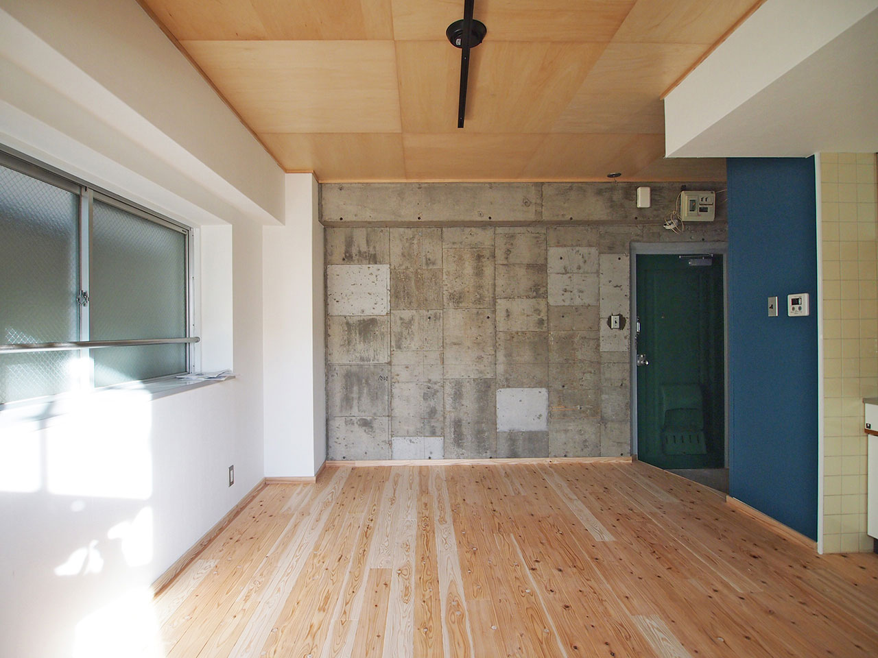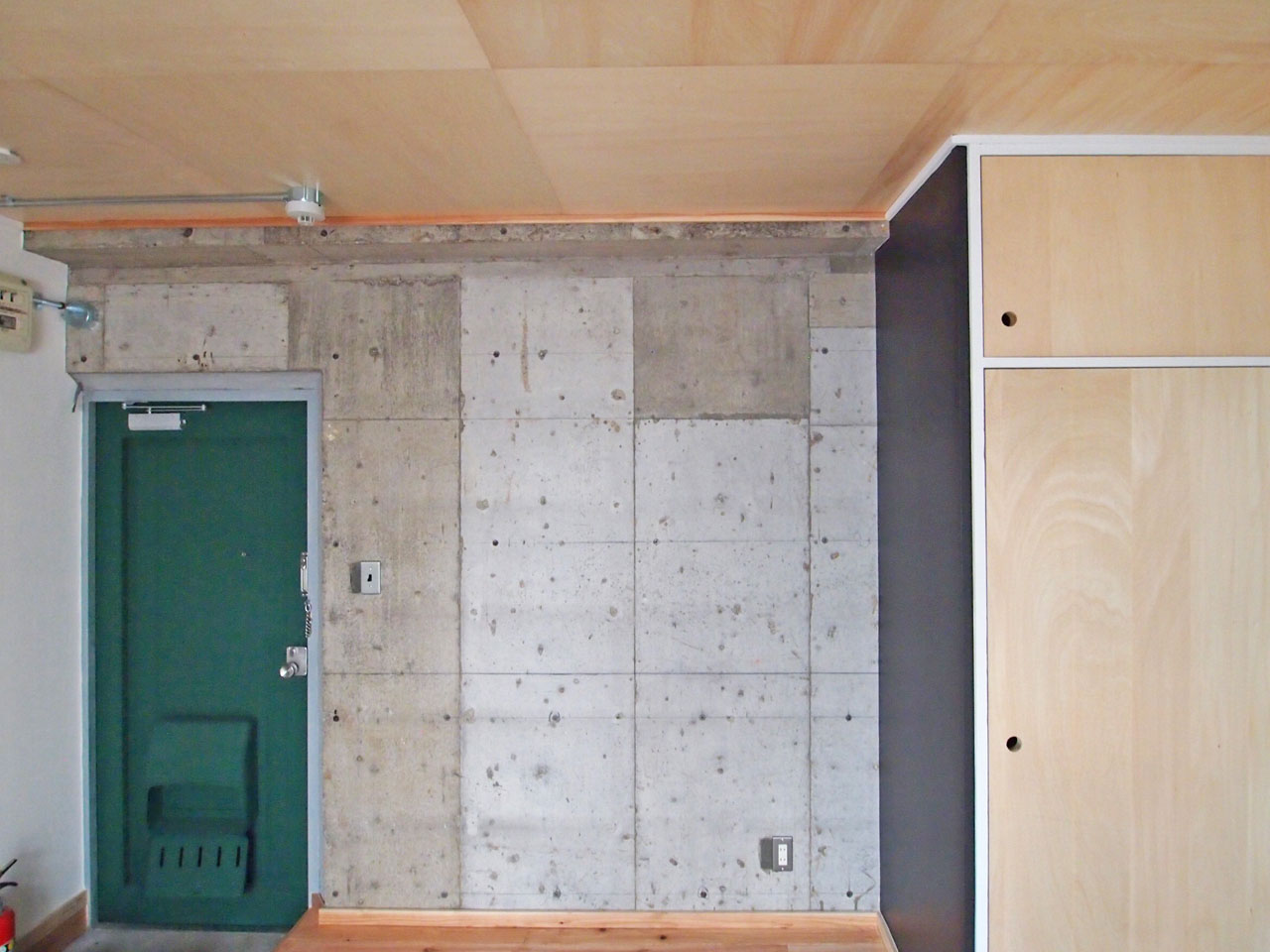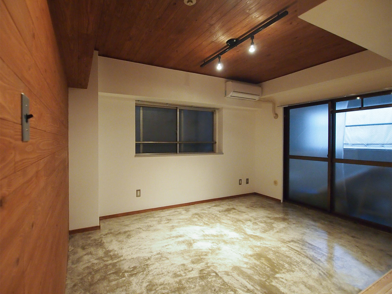 壁面の解体工事の過程で出てきたコンクリート素地の壁に下地材で仕上げた天井面と、敢えて作り込み過ぎない引きの発想の空間。暖色のあかりを静かに灯せば倉庫や作業場のような雰囲気が醸し出されるかもしれません。