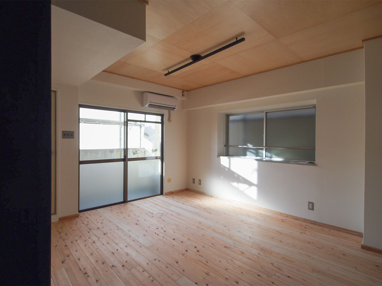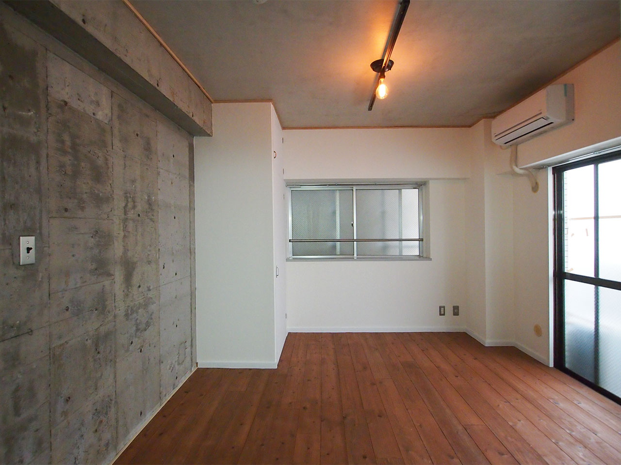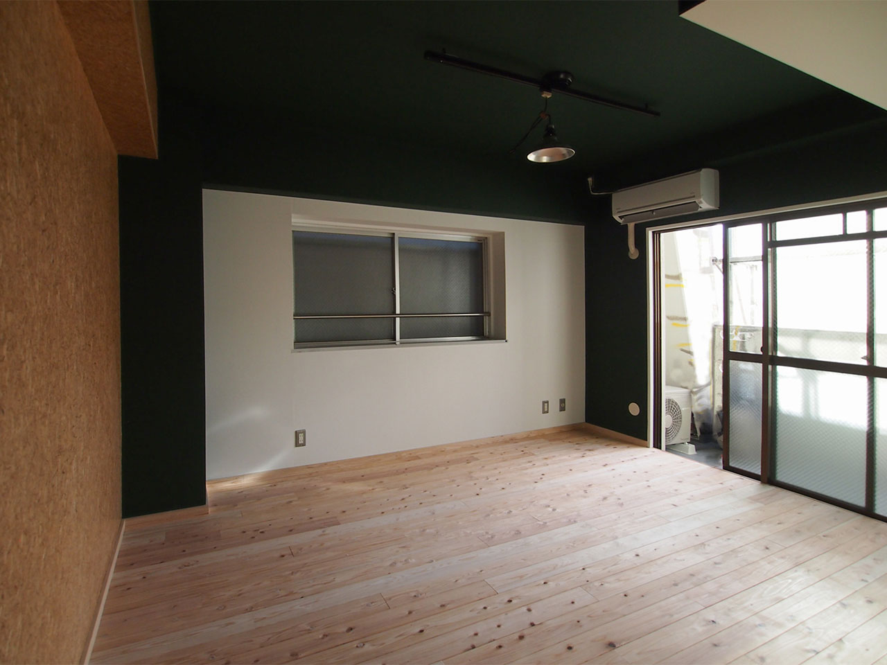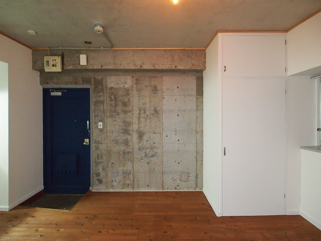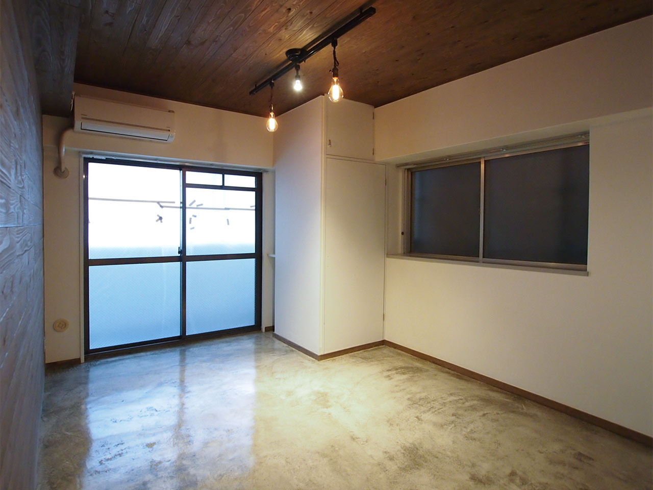 壁面の解体工事の過程で出てきたコンクリート素地の壁に下地材で仕上げた天井面と、敢えて作り込み過ぎない引きの発想の空間。暖色のあかりを静かに灯せば倉庫や作業場のような雰囲気が醸し出されるかもしれません。