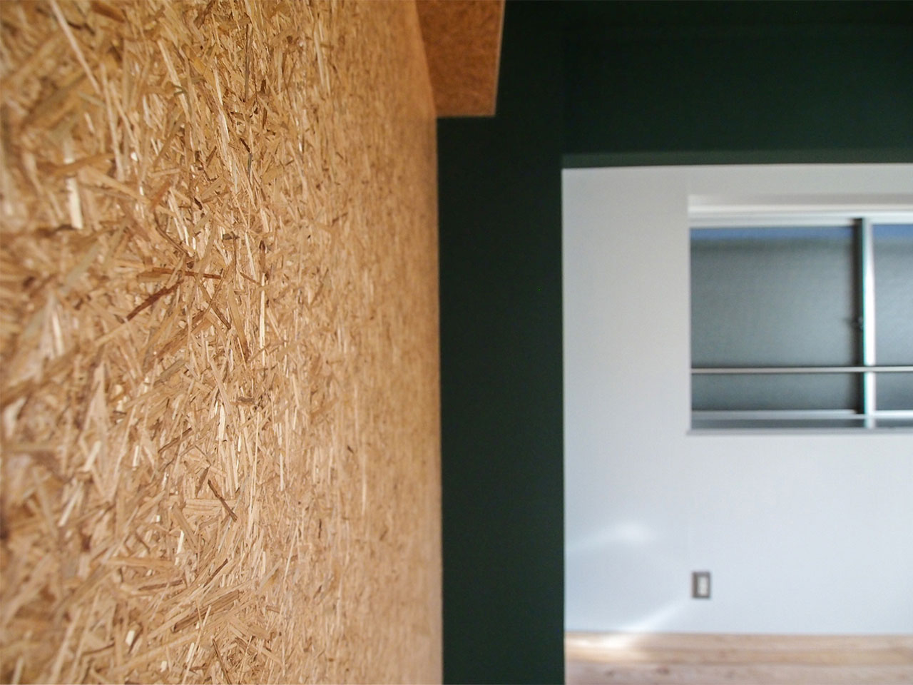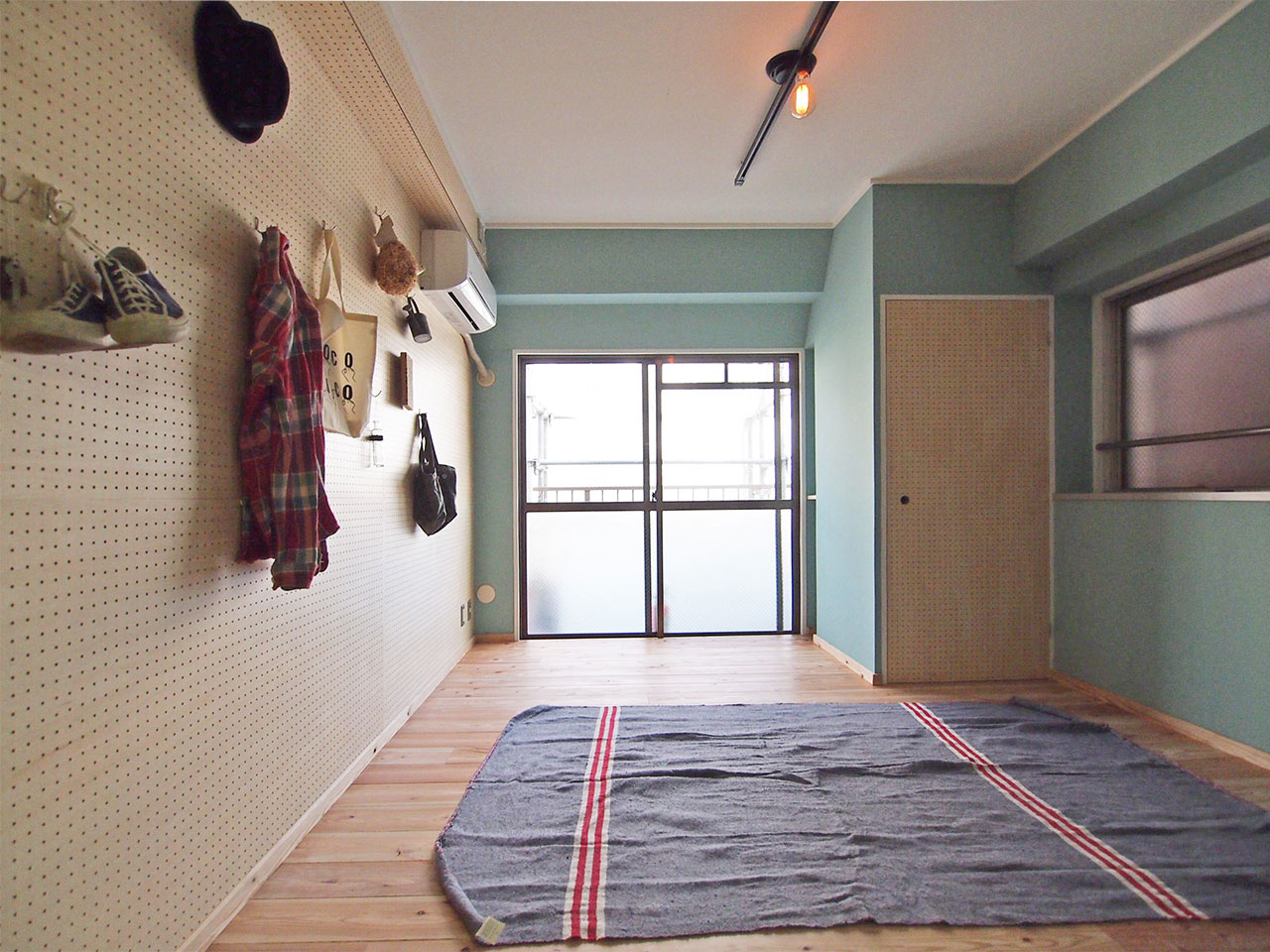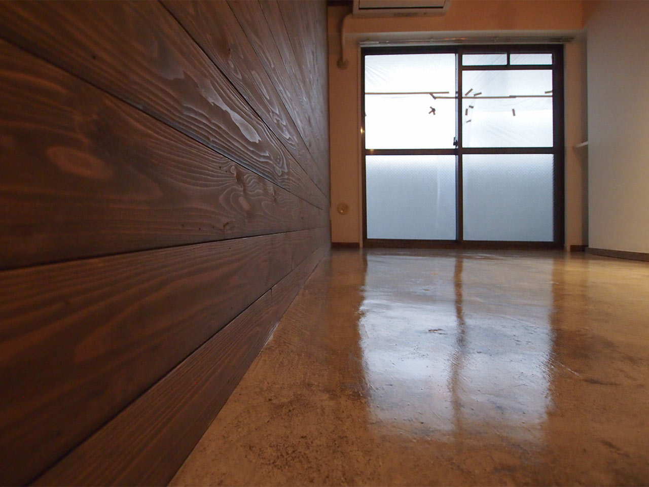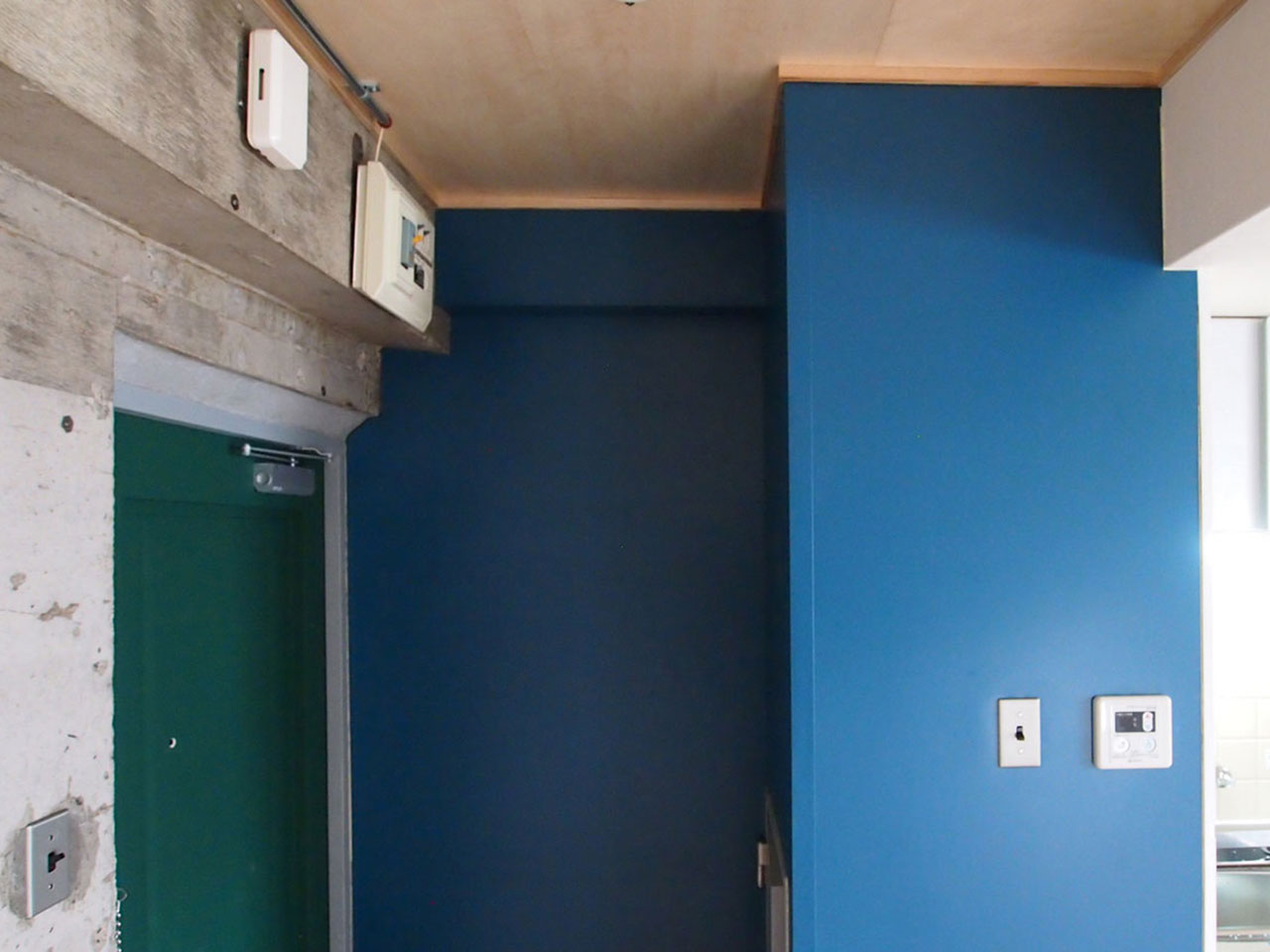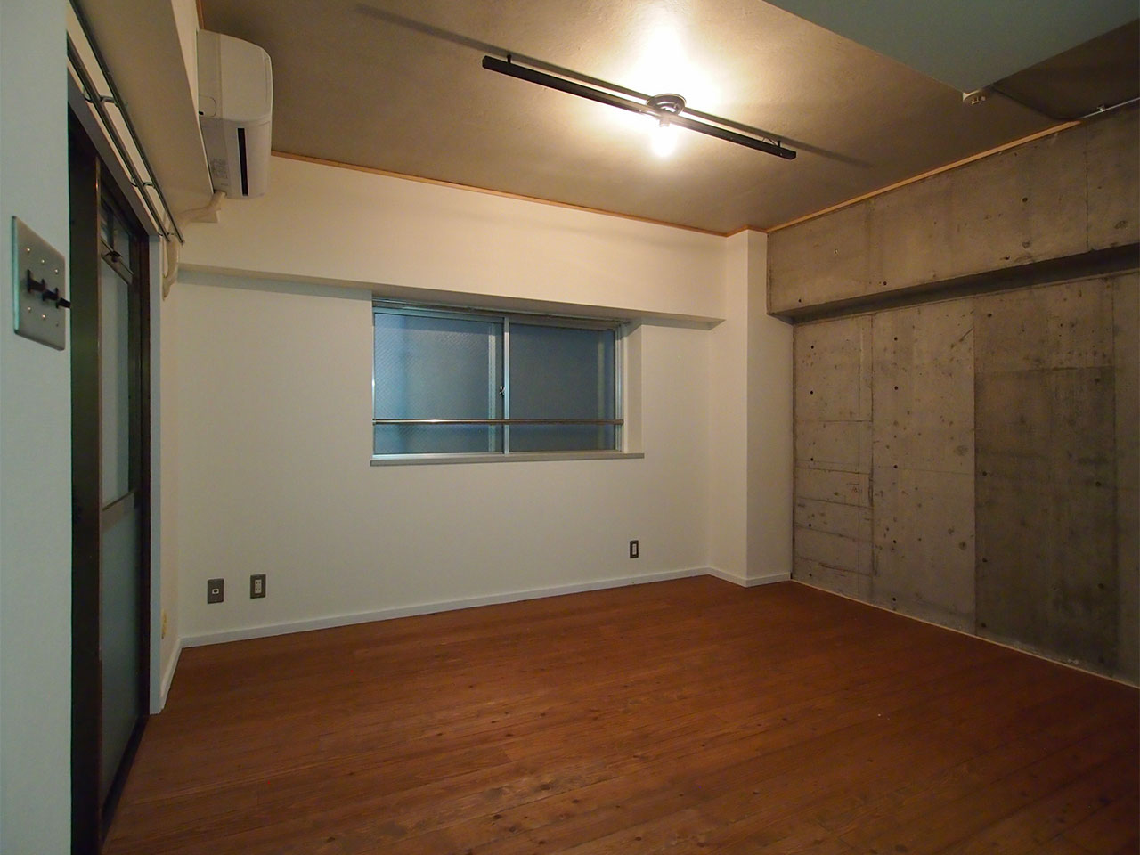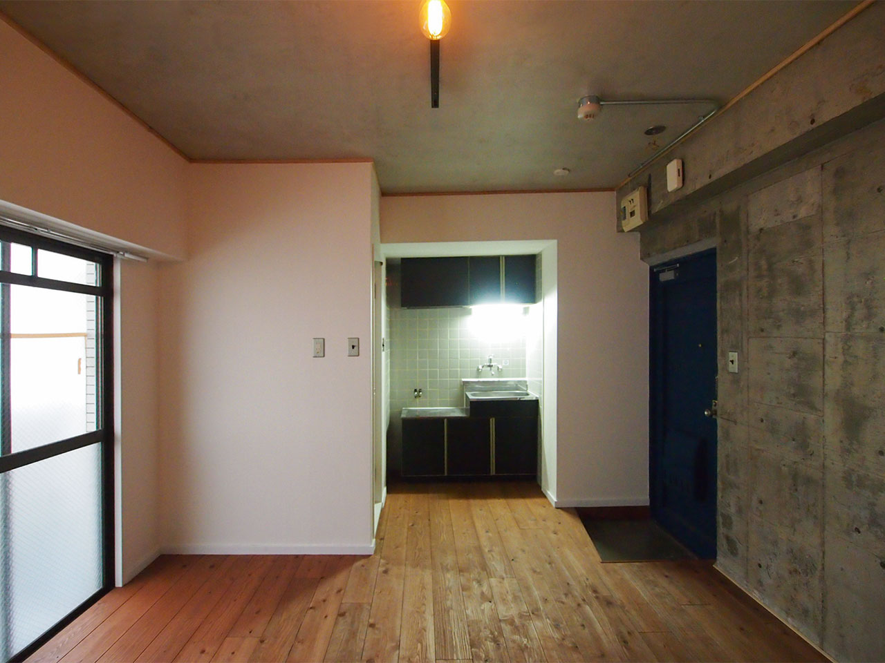 壁面の解体工事の過程で出てきたコンクリート素地の壁に下地材で仕上げた天井面と、敢えて作り込み過ぎない引きの発想の空間。暖色のあかりを静かに灯せば倉庫や作業場のような雰囲気が醸し出されるかもしれません。