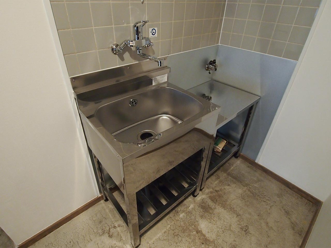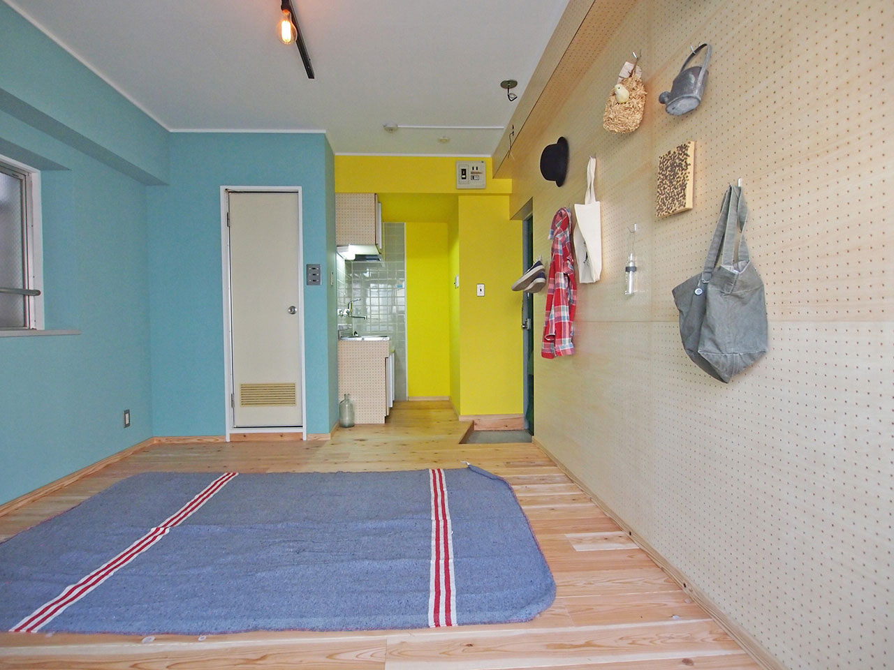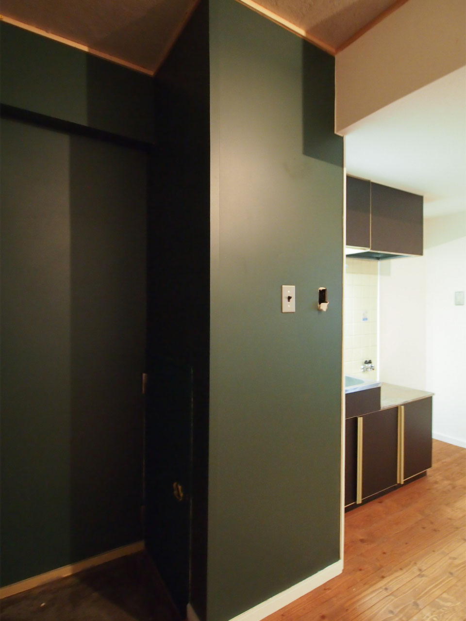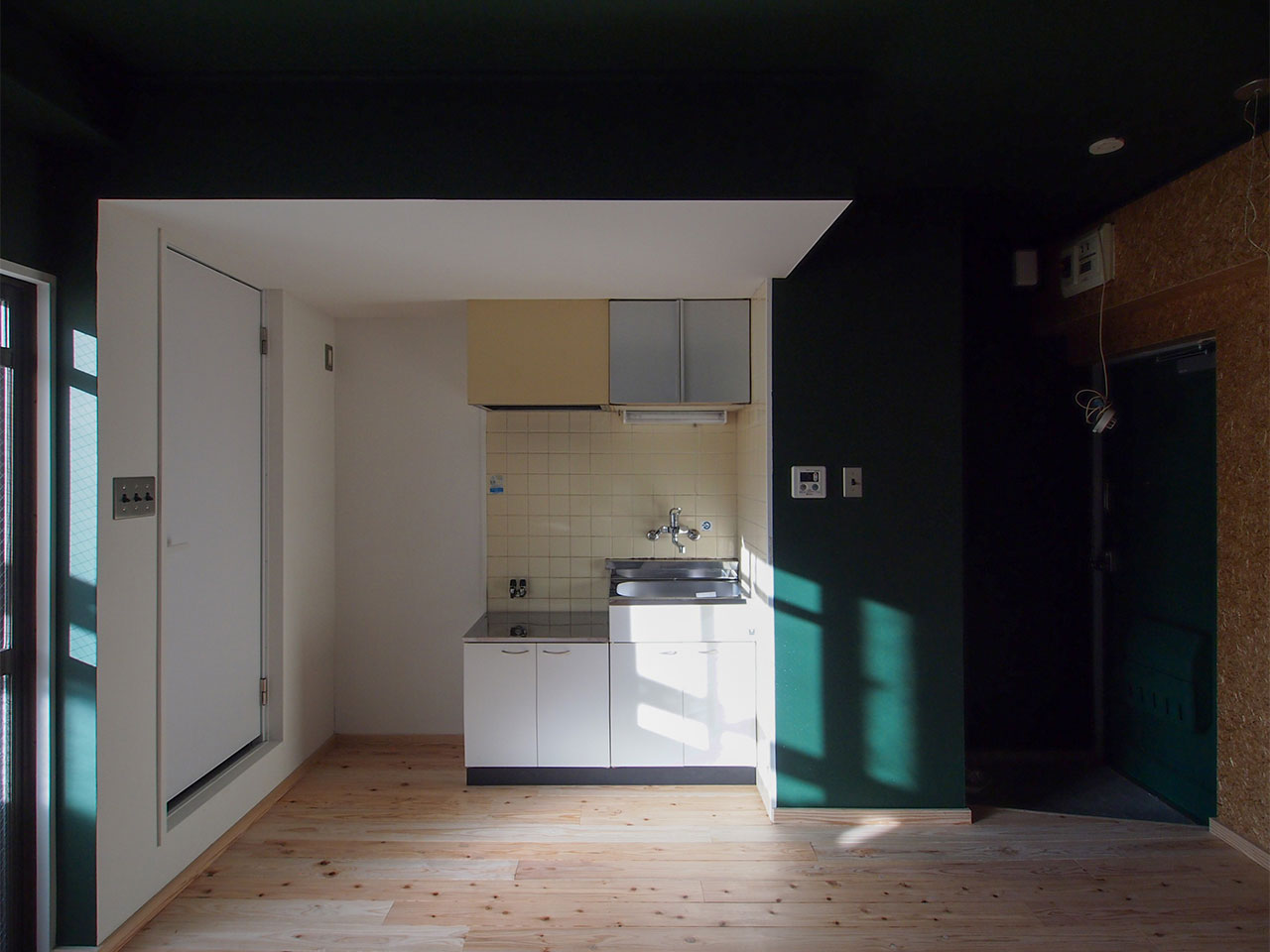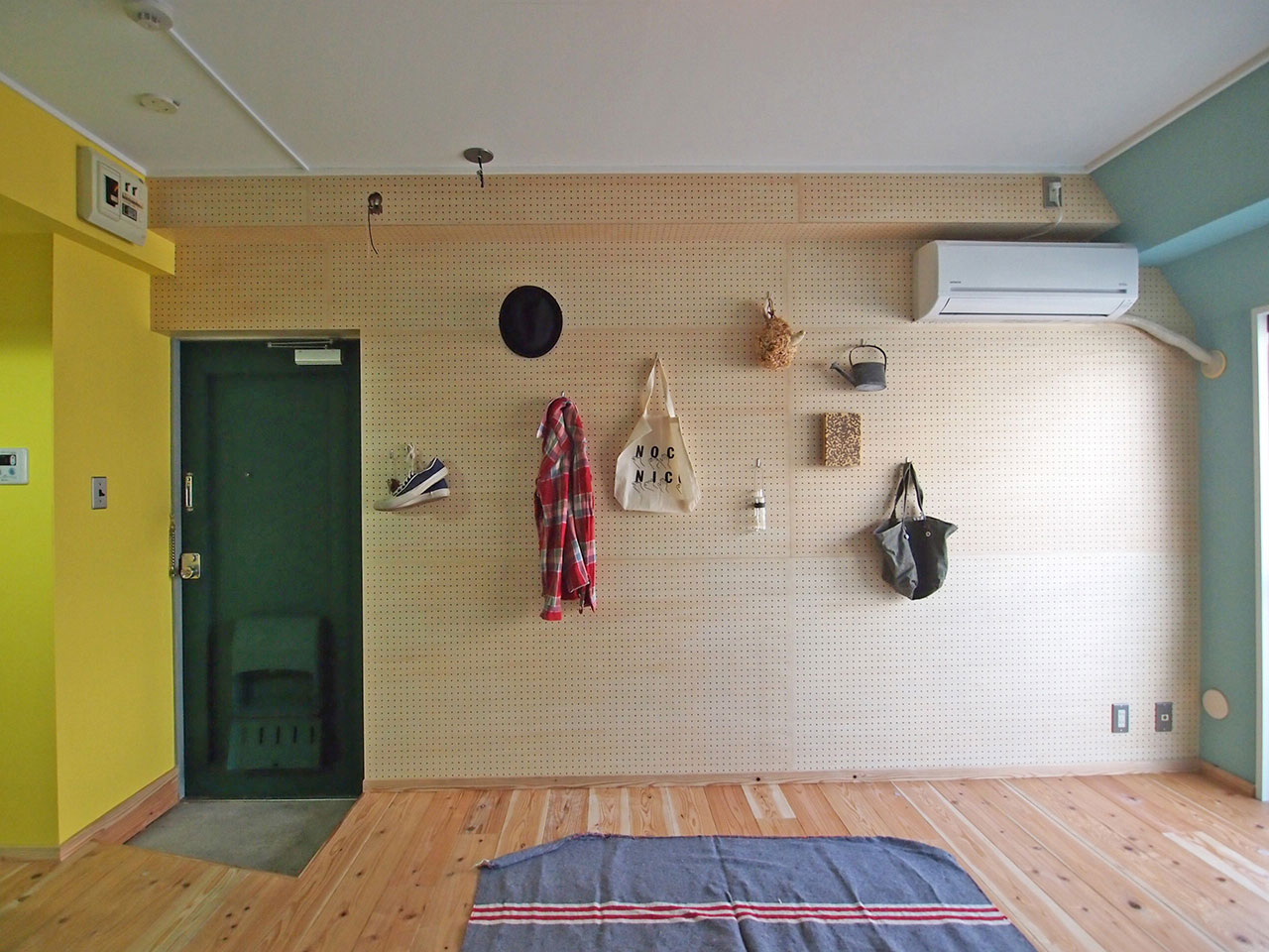 壁面の解体工事の過程で出てきたコンクリート素地の壁に下地材で仕上げた天井面と、敢えて作り込み過ぎない引きの発想の空間。暖色のあかりを静かに灯せば倉庫や作業場のような雰囲気が醸し出されるかもしれません。